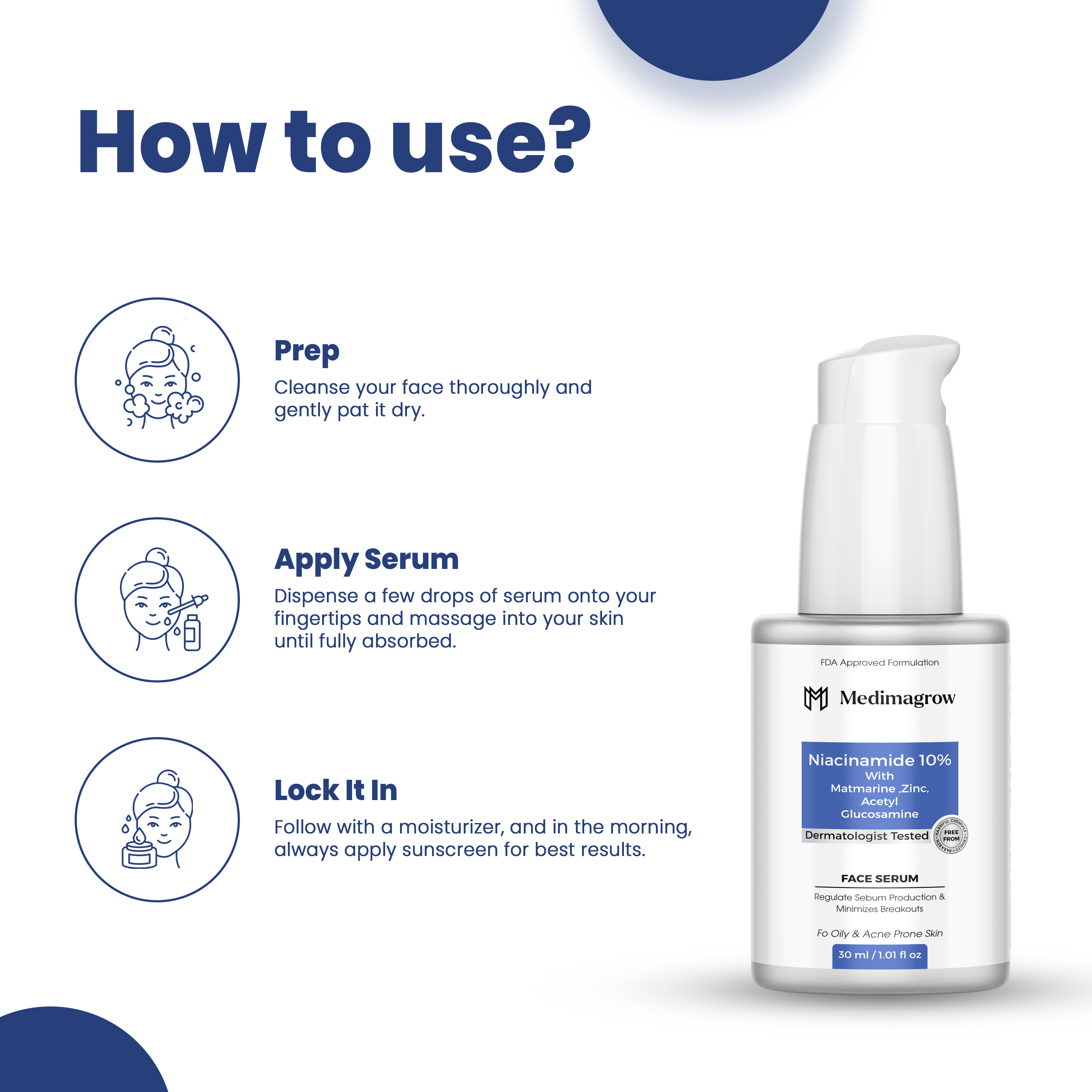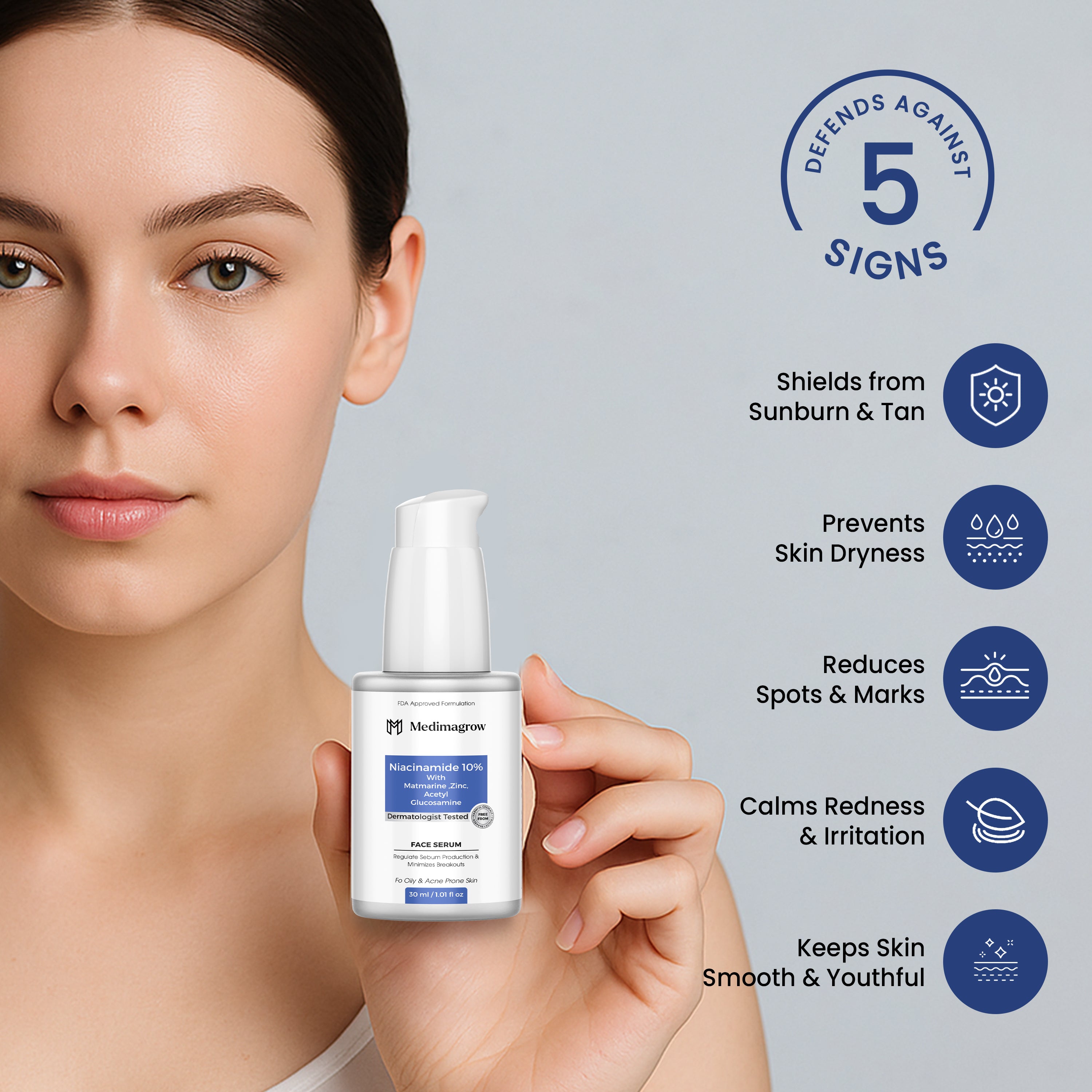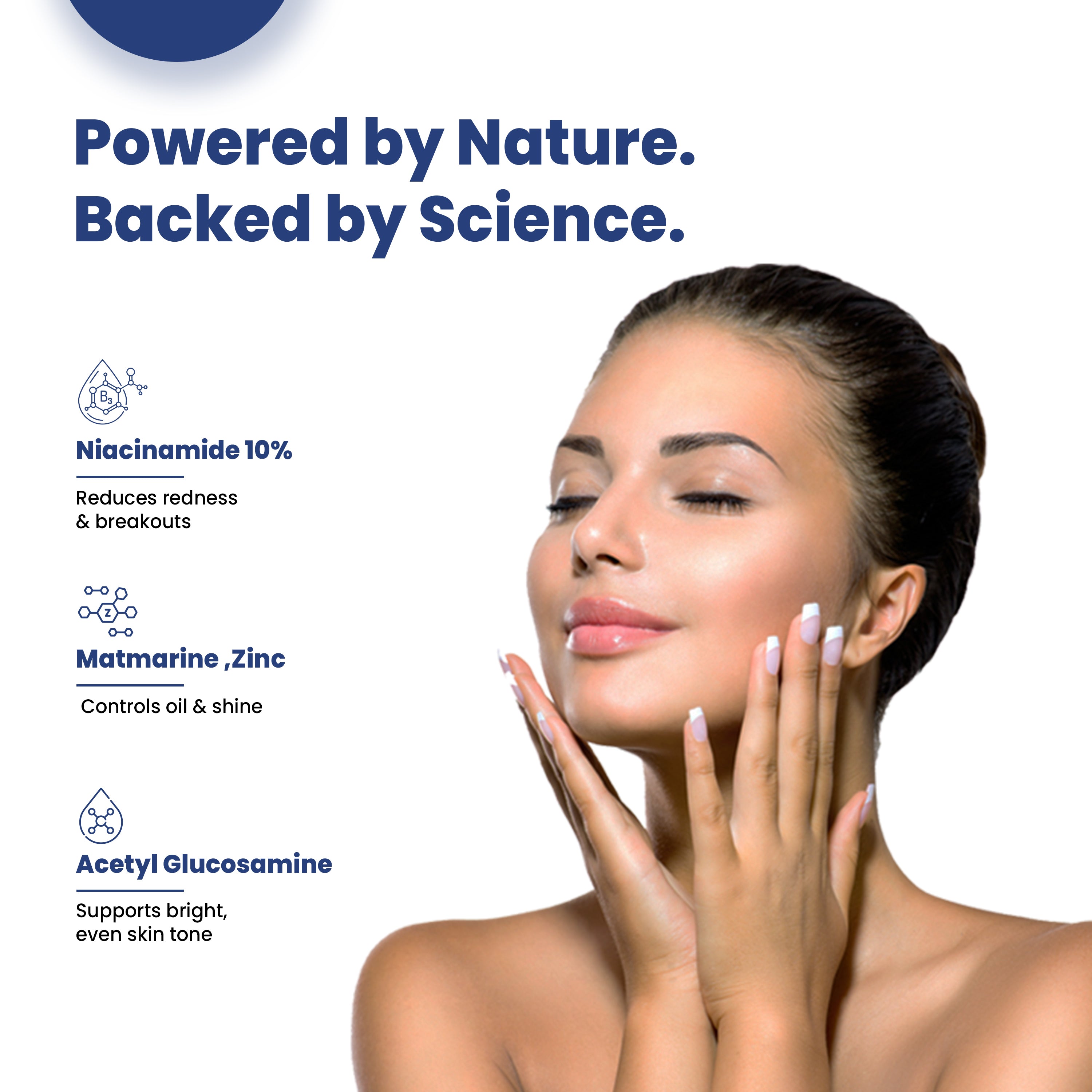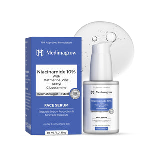 Experience clear, bright, and balanced skin with Niacinamide Serum, crafted with powerful actives like 10% Niacinamide, Zinc PCA, Acetyl Glucosamine, and Matmarine This water-based, fast-absorbing serum targets oil control, pore size reduction, acne marks, and skin texture improvement.