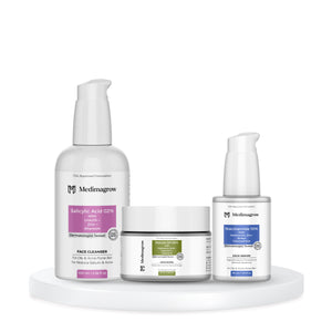 A powerful 3-step combo to fight acne, reduce pores, control oil, and hydrate deeply. Includes Salicylic Acid Cleanser, 10% Niacinamide Serum & Marula Oil Moisturizer for smooth, clear, glowing skin